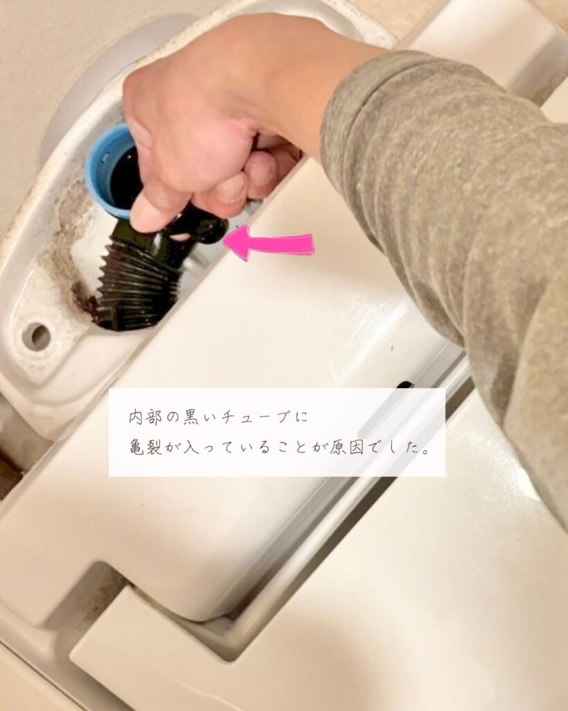 調査を行ったところ、内部の黒いチューブに亀裂が入っていることが原因でした。これは経年劣化によるものです。