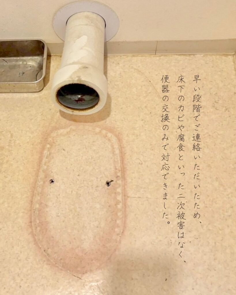 床下のカビや腐食といった二次被害はなく、便器の交換のみで対応できました。
